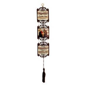Adorno feito em madeira mdf no formato quadrado com imagem resinada de Sagrada Família.