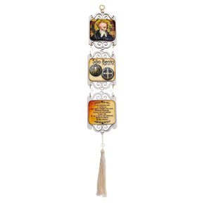 Adorno feito em madeira mdf no formato quadrado com imagem resinada de São Bento.