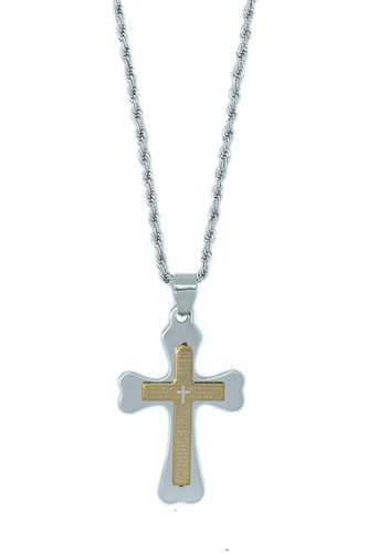 Corrente em Aço inoxidável modelo cordão 60cm com pingente de Cruz na cor amarelo e oração do pai nosso gravada a laser na cor prata.