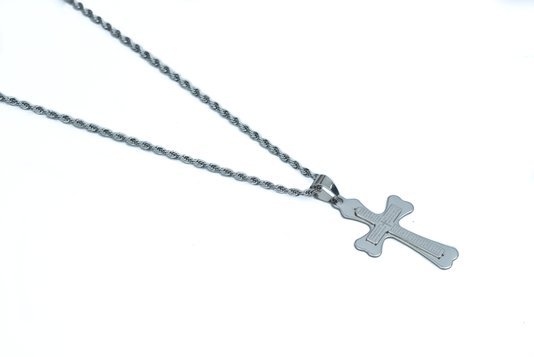 Corrente em Aço inoxidável modelo cordão 60cm com pingente de Cruz na cor prata e oração do pai nosso gravada a laser na cor prata.