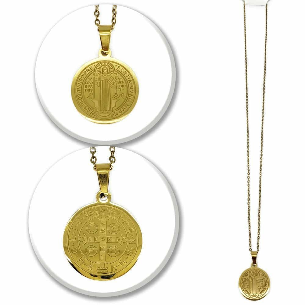 Corrente feita em Aço Inoxidável na cor Dourada fina no tamanho de 45cm com Pingente religioso feito em aço inoxidável.