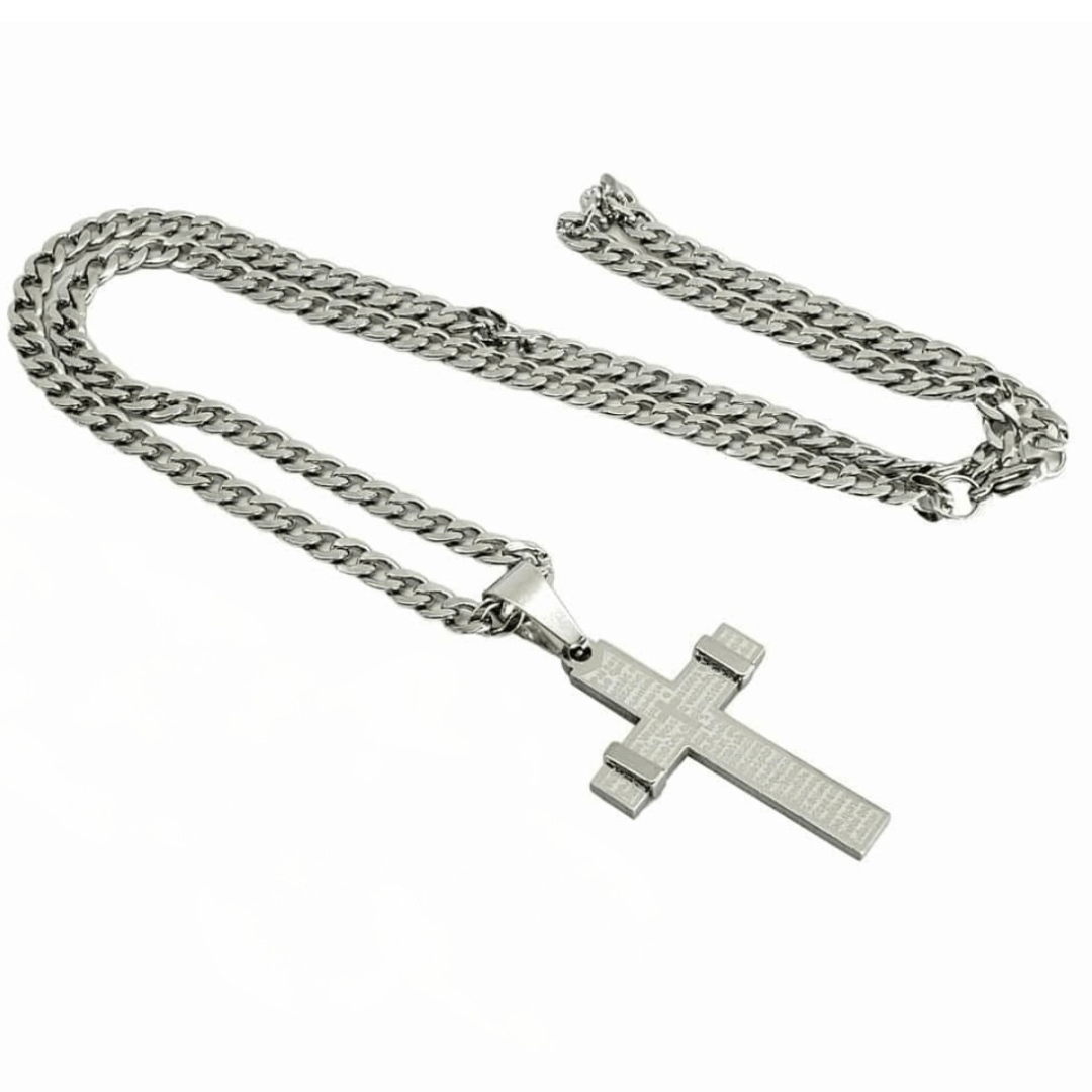 Colar em inox prata com pingente de crucifixo com oração do Pai Nosso. (Oração: Pai Nosso que estais nos Céus, santificado seja o vosso Nome, venha a nós o vosso Reino, seja feita a vossa vontade assim na terra como no Céu. O pão nosso de cada dia nos dai hoje, perdoai-nos as nossas ofensas assim como nós perdoamos a quem nos tem ofendido, e não nos deixeis cair em tentação, mas livrai-nos do Mal. Amém).