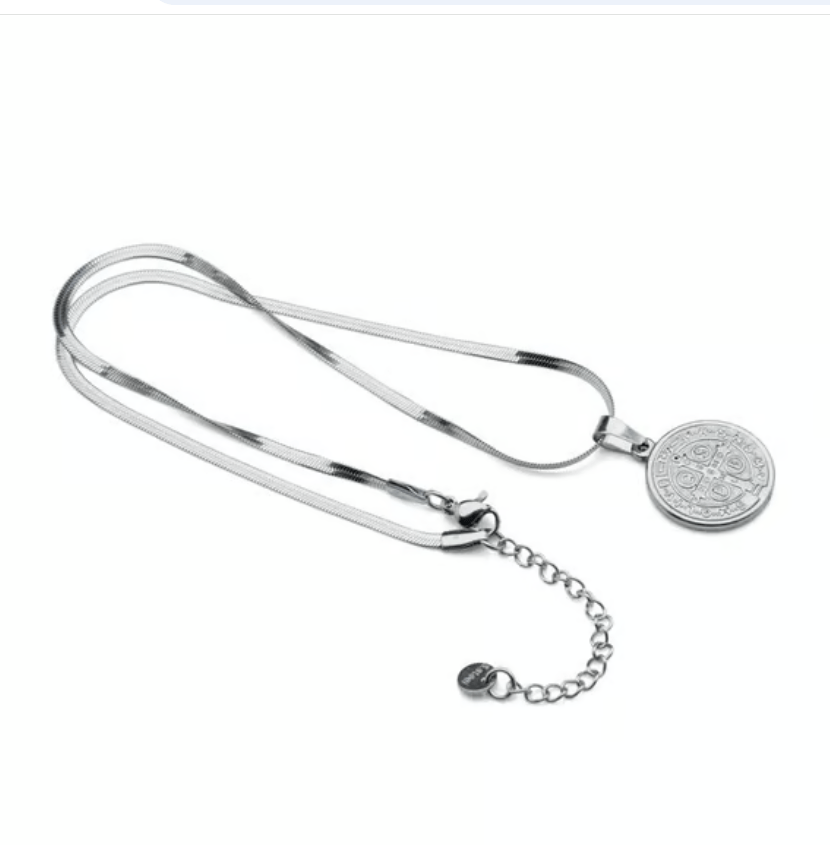 Corrente em Aço inoxidável laminada com 45cm de comprimento com pingente de São Bento
