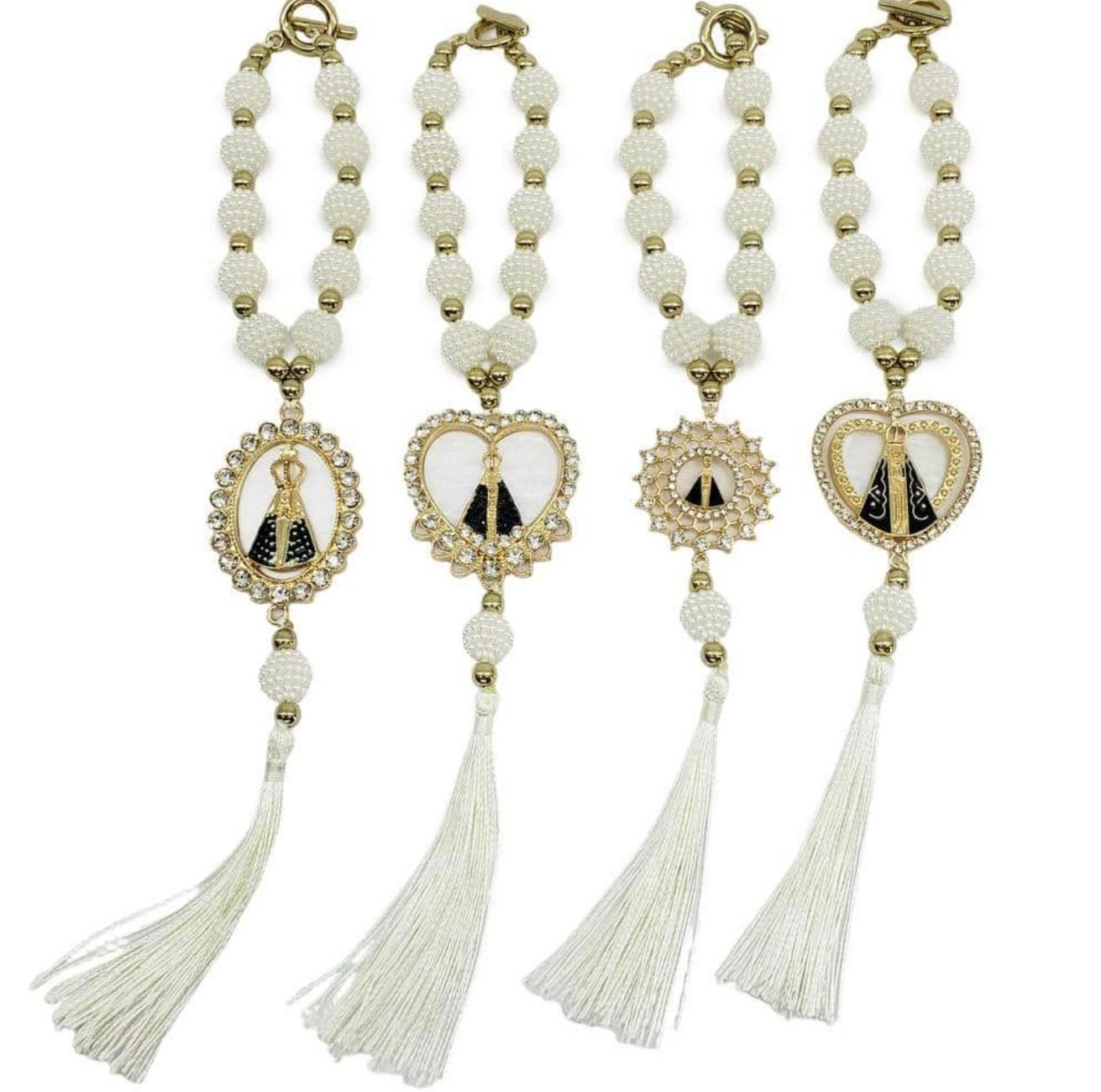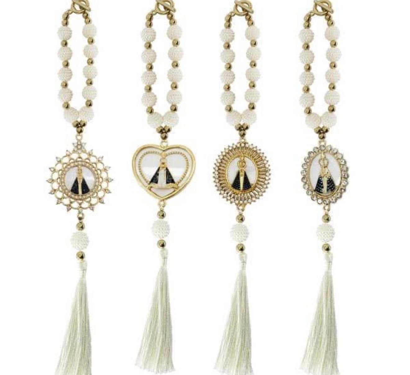 KIT CONTENDO 12 UNIDADES DE DEZENAS DE NOSSA SENHORA APARECIDA COM STRASS E POM POM
