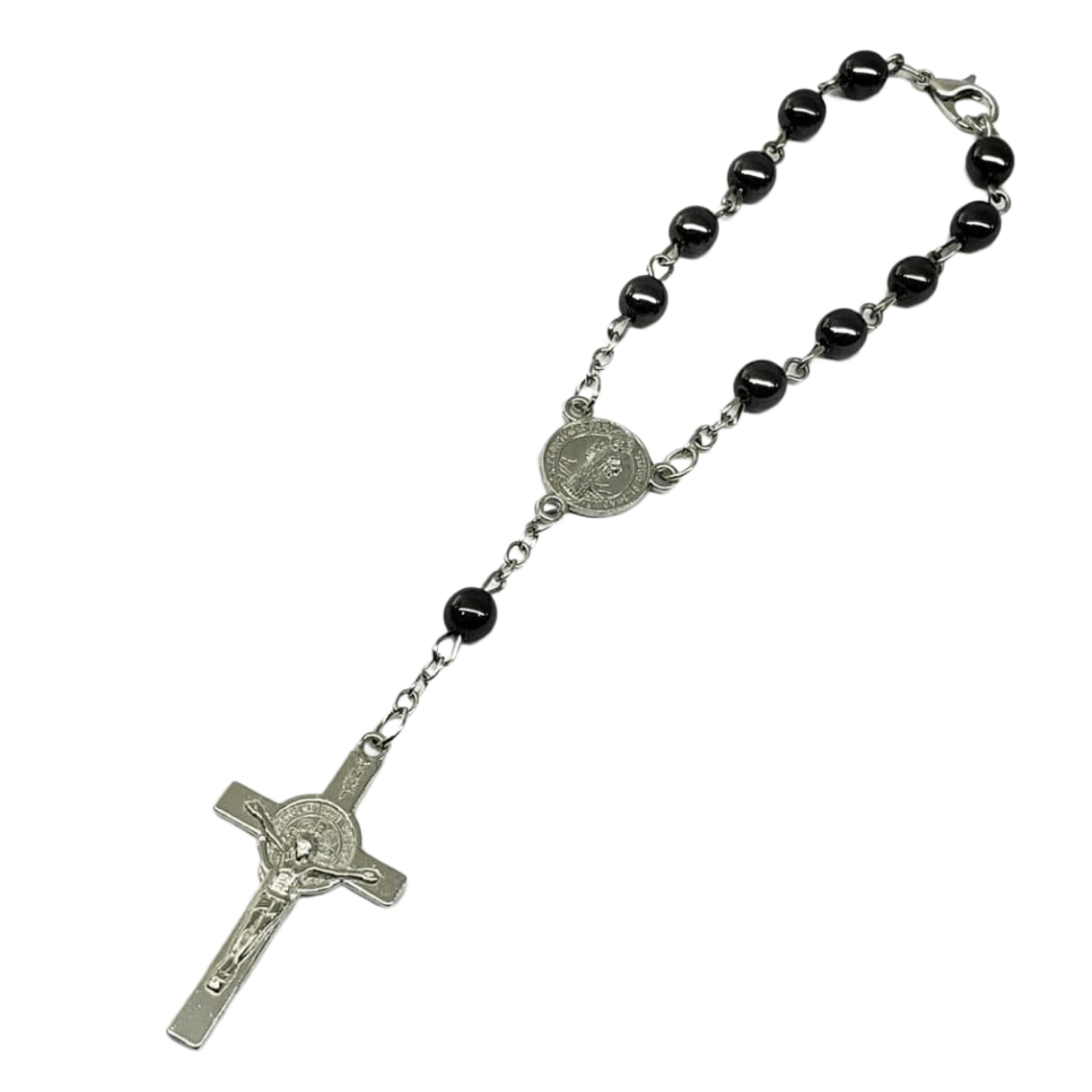 A peça apresenta contas em hematita cinza chumbo. Tanto na parte frontal quanto na posterior do produto, contando também com a Medalha. Um fecho prata localizado na extremidade da dezena, dá o auxílio necessário para colocá-la no local desejado.