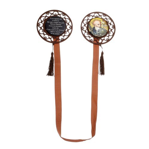 Fita de cetim, na cor marrom, medindo 2,5 cm de largura e, em média, 100 cm de comprimento.