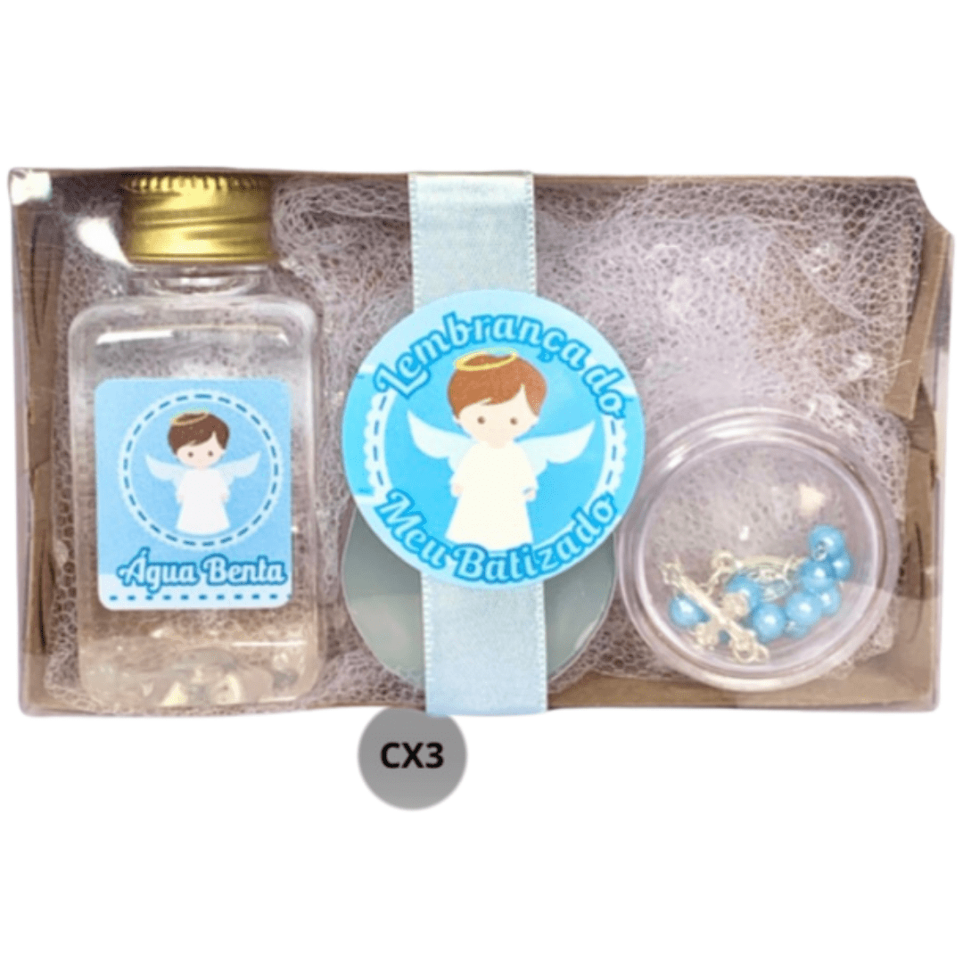 Kit Batismo: Água + Vela + Terço - Azul