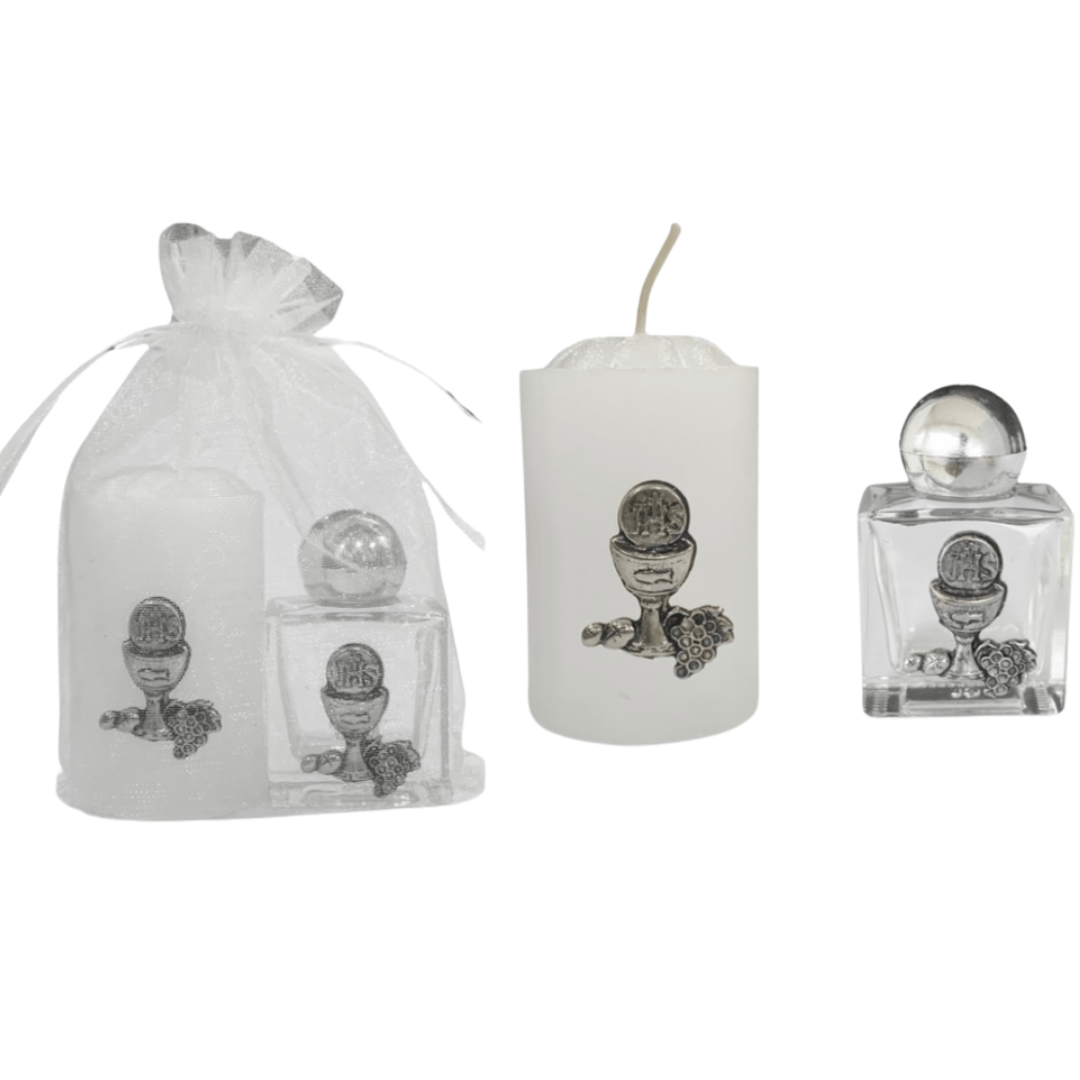 Kit Vela Votiva + Porta Água Benta Eucaristia - Prata