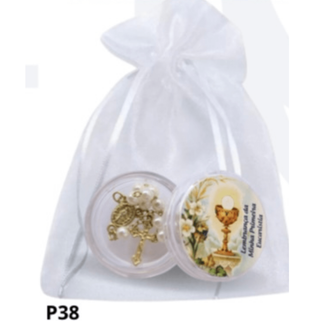 Lembrança Eucaristia: Porta Terço Acrílico + Mini Tercinho - P38