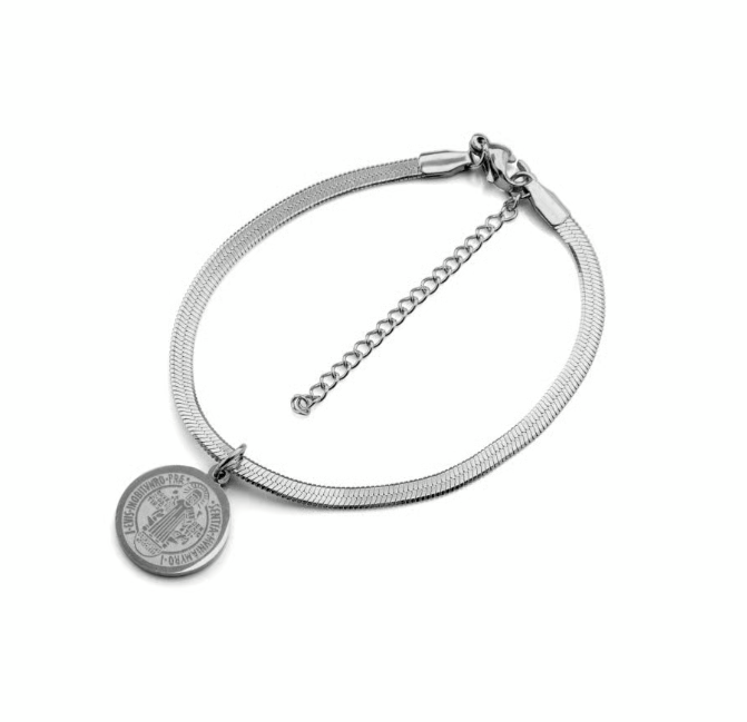 A peça inteiramente prata com corrente laminada possui um pingente de São Bento gravado a laser. Para ser ajustado ao pulso, há um fecho de metal prata.