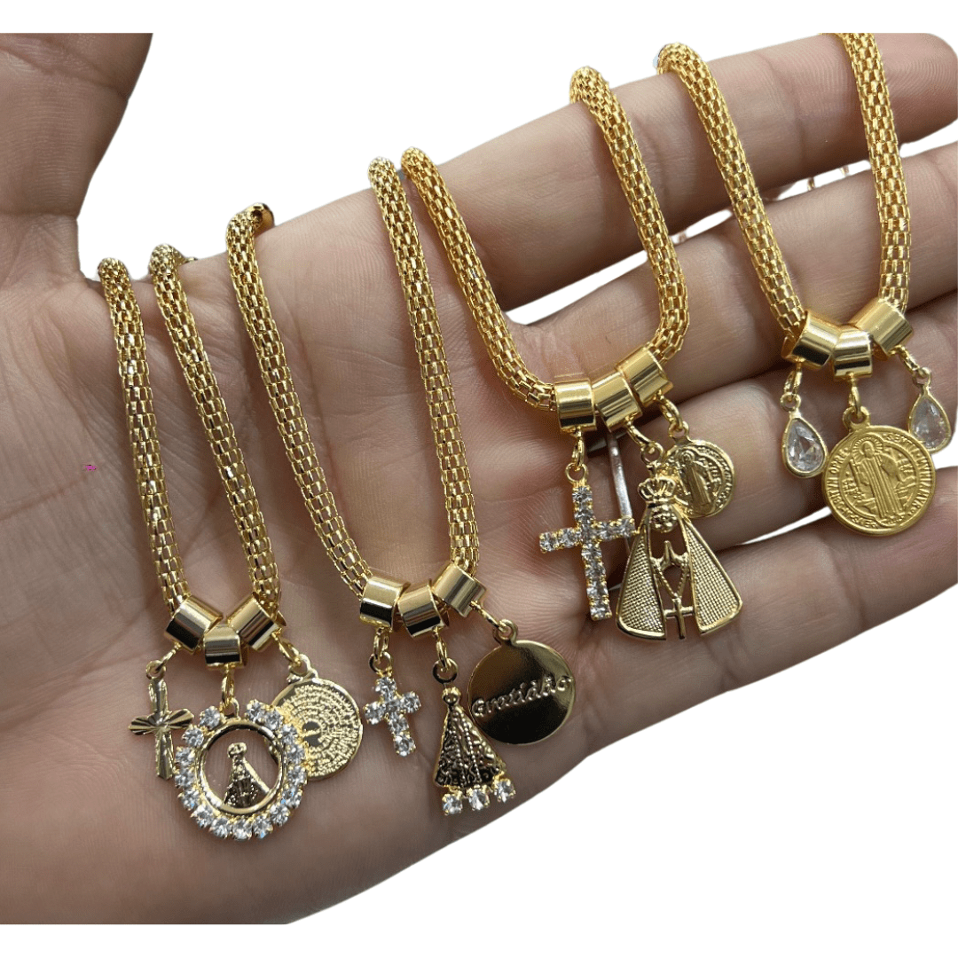 Linda Pulseira folheada, com três delicados berloques em tema religioso. Cada Pulseira possui seu próprio conjunto de Berloques todos trabalhados com pedras de strass; a pulseira possui ainda, corrente extensora na ponta para melhor regulagem do tamanho. Os Berloques São conectados à Pulseira junto a um elo de metal lindamente folheado a ouro, tornando um produto ainda mais exclusivo.