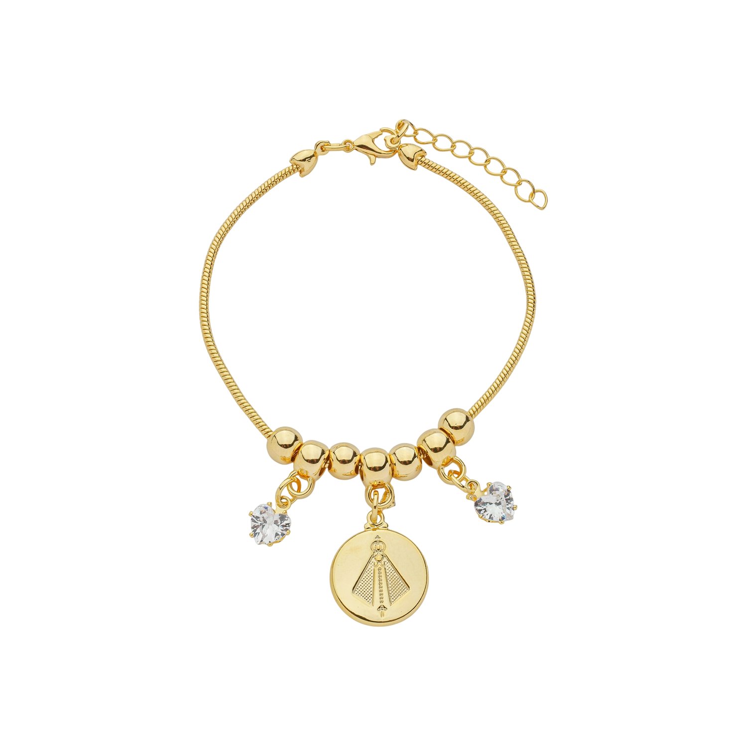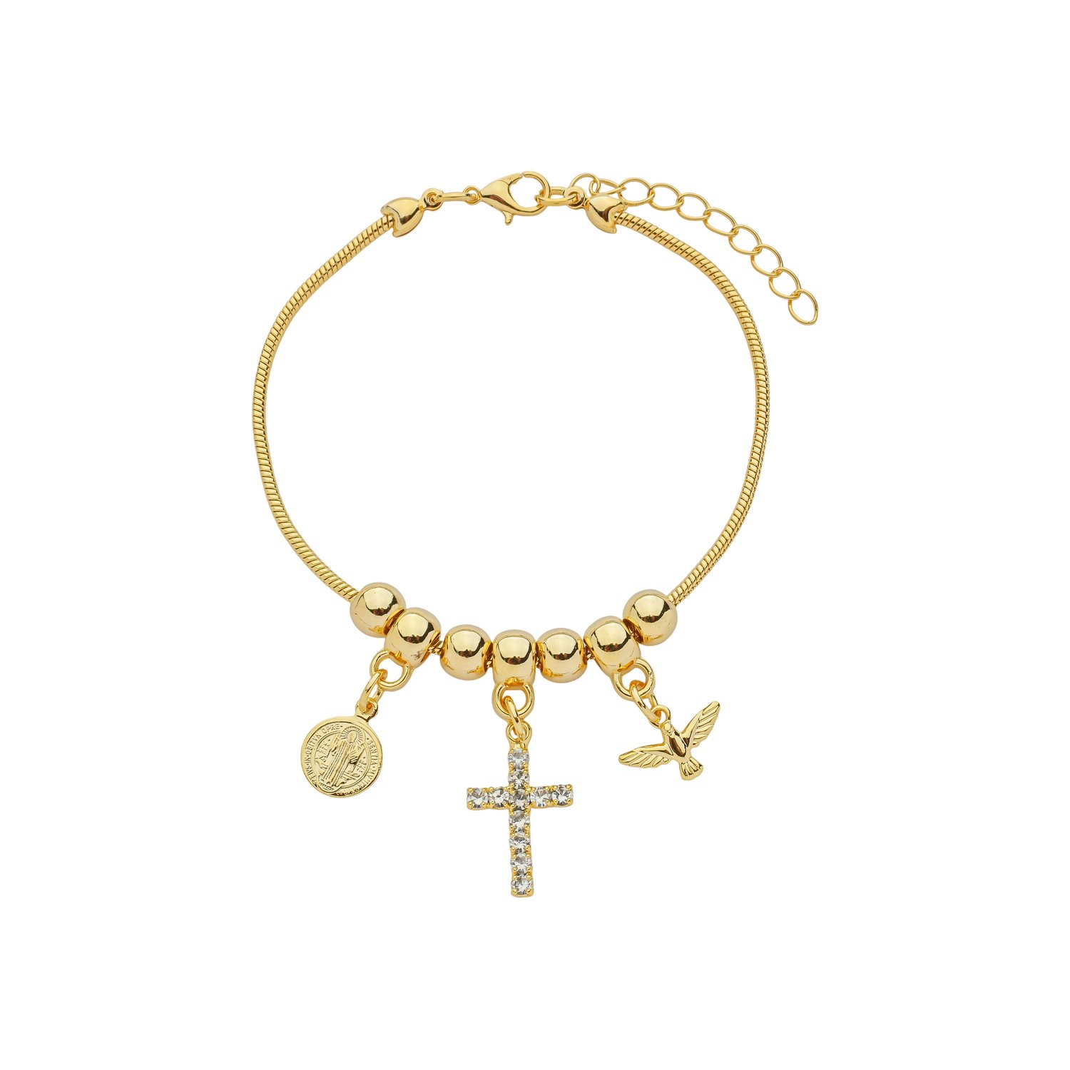 Linda Pulseira folheada, com três delicados berloques em tema religioso. Cada Pulseira possui seu próprio conjunto de Berloques todos trabalhados com pedras de strass; a pulseira possui ainda, corrente extensora na ponta para melhor regulagem do tamanho. Os Berloques São conectados à Pulseira junto a um elo de metal lindamente folheado a ouro, tornando um produto ainda mais exclusivo.