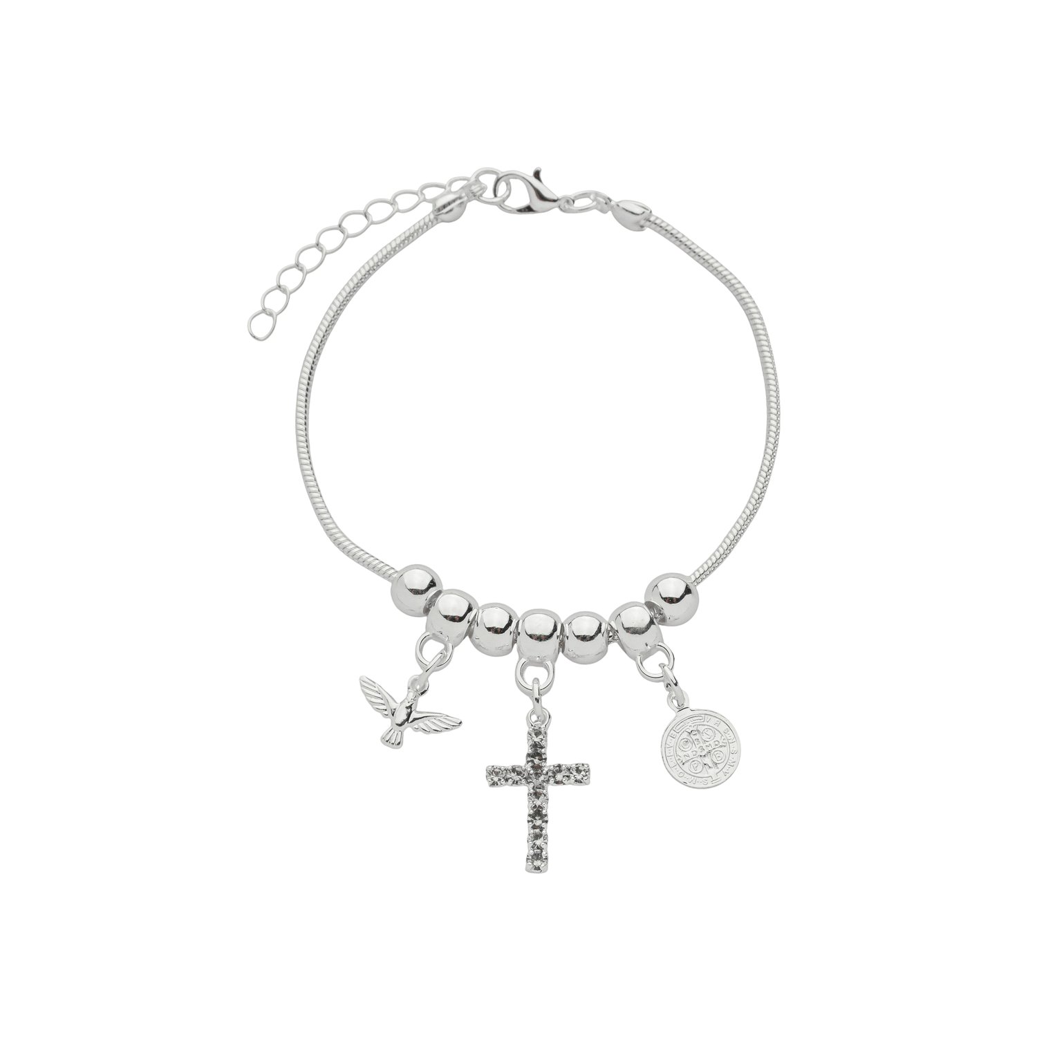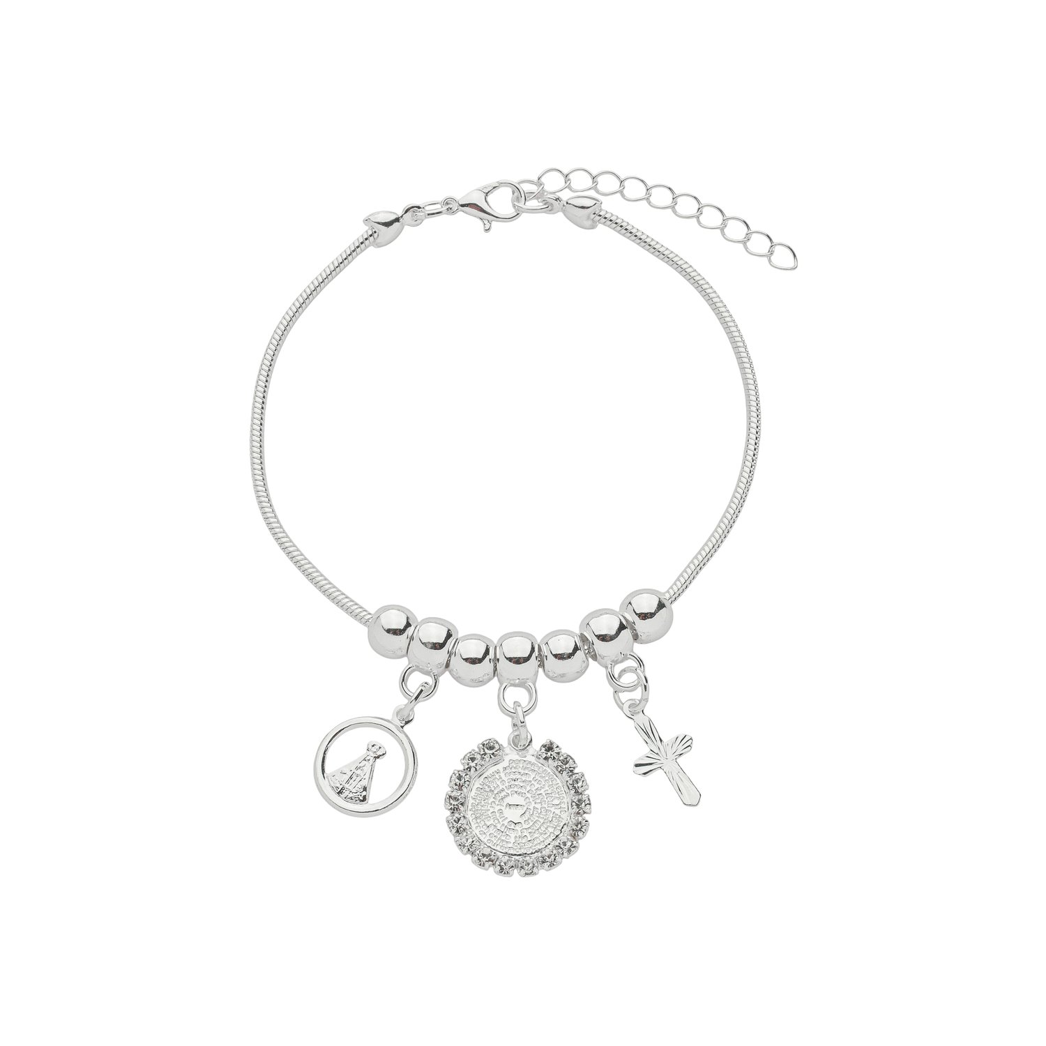 Linda Pulseira folheada, com três delicados berloques em tema religioso. Cada Pulseira possui seu próprio conjunto de Berloques todos trabalhados com pedras de strass; a pulseira possui ainda, corrente extensora na ponta para melhor regulagem do tamanho. Os Berloques São conectados à Pulseira junto a um elo de metal lindamente folheado a ouro, tornando um produto ainda mais exclusivo.
