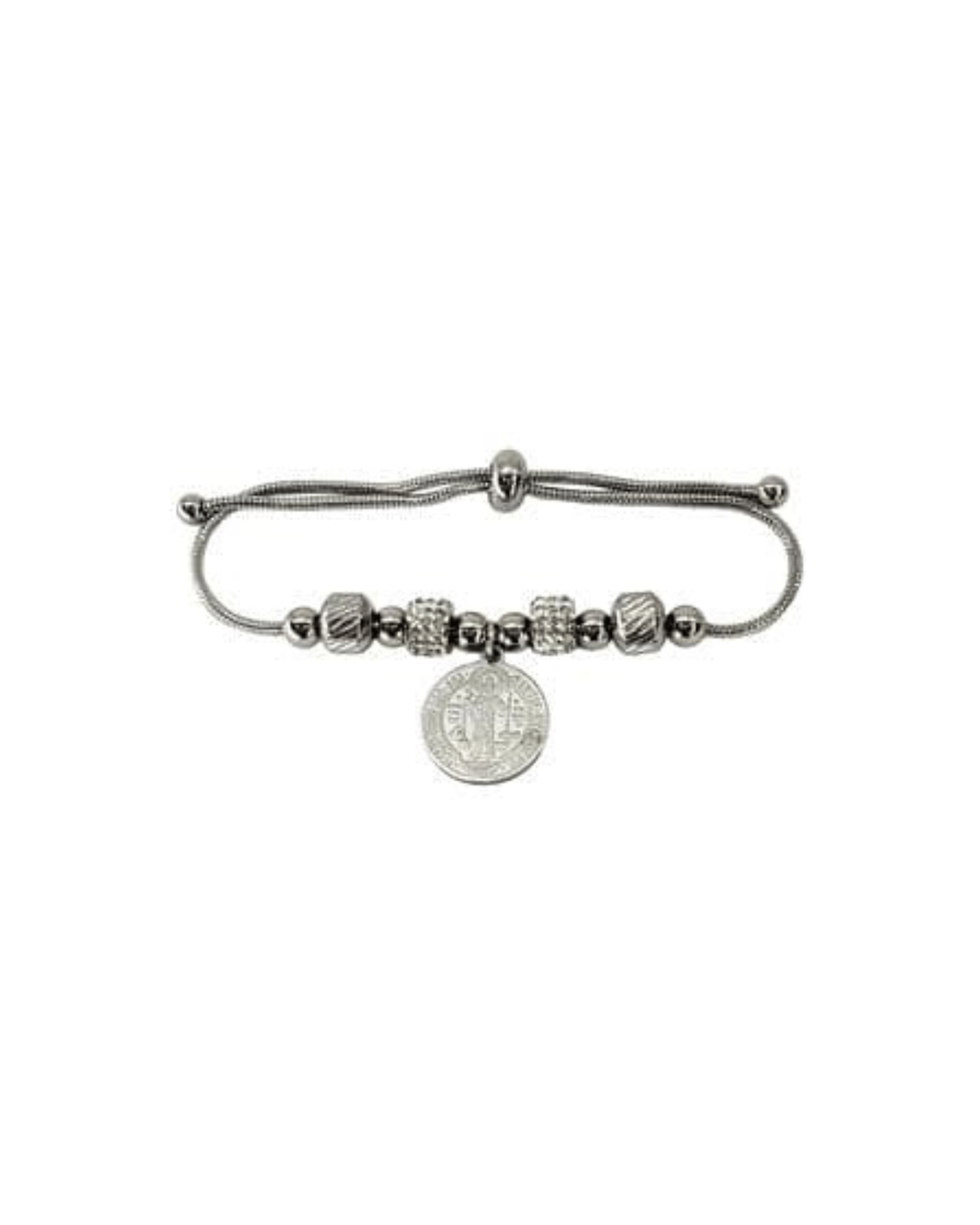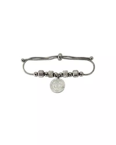 A peça inteiramente prata com corrente laminada possui um pingente de São Bento gravado a laser. Para ser ajustado ao pulso, há um fecho de metal prata.