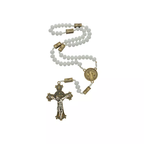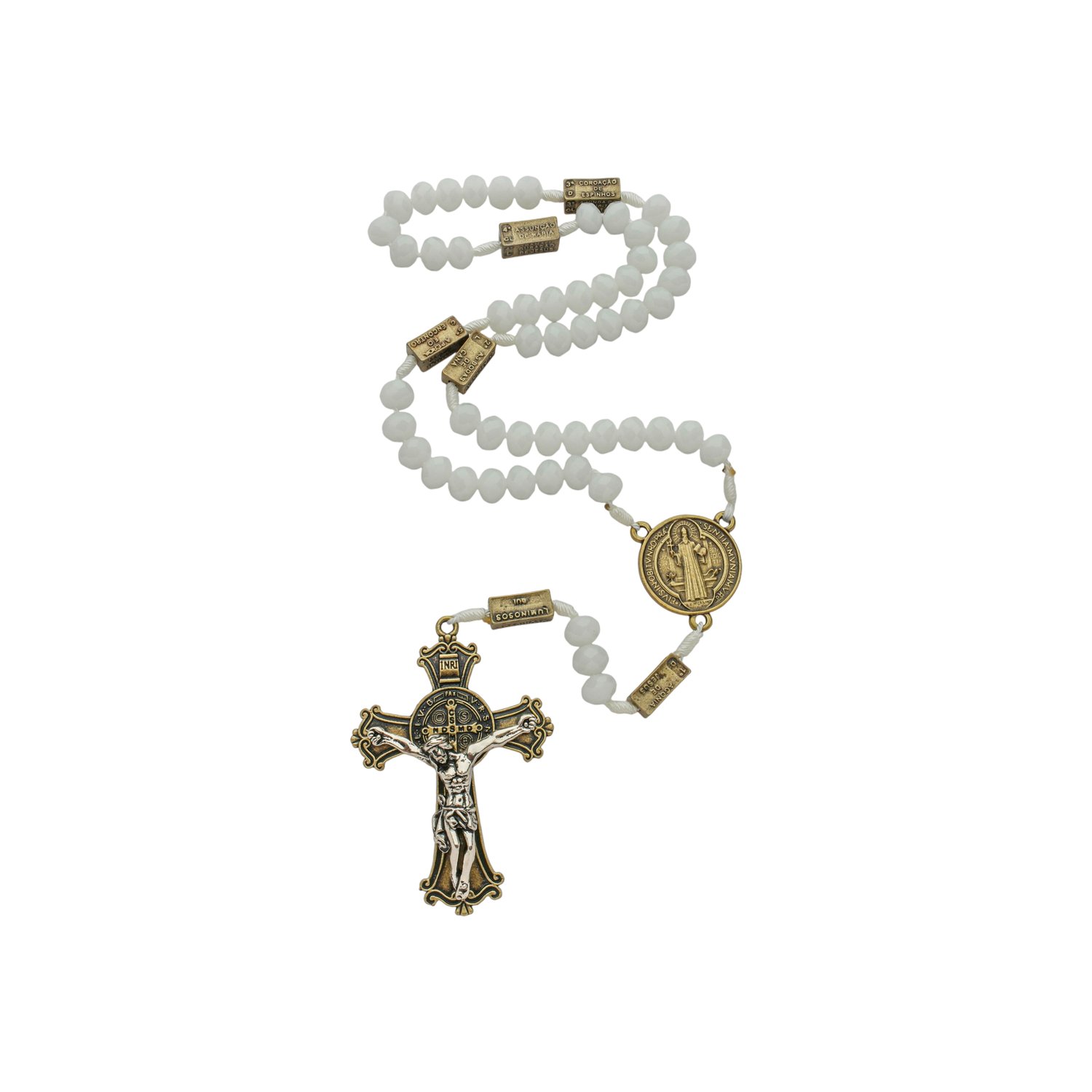 A cruz, confeccionada em metal bronze com detalhes na cor prata, destaca-se em alto relevo com a imagem do Cristo, tornando este terço uma peça única e cheia de significado. Tendo também a medalha de São Bento em ambos os lados inspirando a sua proteção.