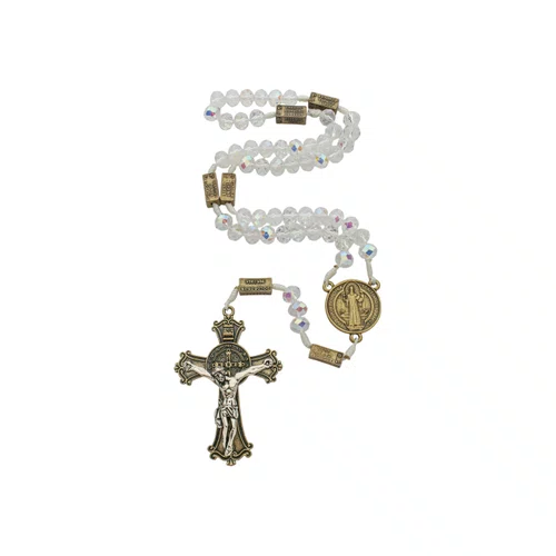 A cruz, confeccionada em metal bronze com detalhes na cor prata, destaca-se em alto relevo com a imagem do Cristo, tornando este terço uma peça única e cheia de significado. Tendo também a medalha de São Bento em ambos os lados inspirando a sua proteção.