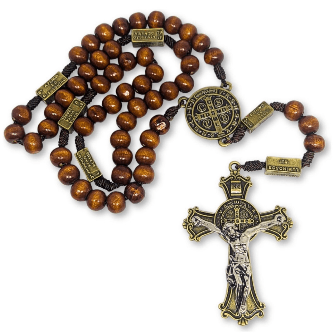 A cruz, confeccionada em metal bronze com detalhes na cor prata, destaca-se em alto relevo com a imagem do Cristo, tornando este terço uma peça única e cheia de significado. Tendo também a medalha de São Bento em ambos os lados inspirando a sua proteção.
