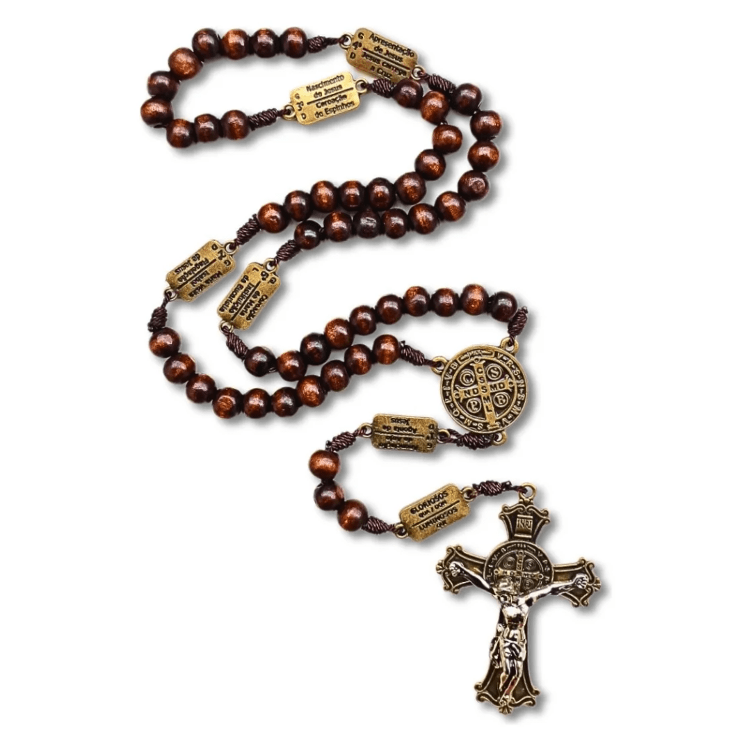 Além disso, os entremeios contam com delicadas chapinhas em bronze, que apresentam a contemplação dos mistérios em todas as faces para você meditar profundamente em cada mistério.