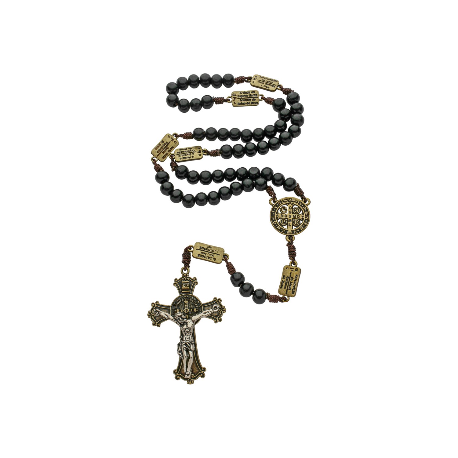 A cruz, confeccionada em metal bronze com detalhes na cor prata, destaca-se em alto relevo com a imagem do Cristo, tornando este terço uma peça única e cheia de significado. Tendo também a medalha de São Bento em ambos os lados inspirando a sua proteção.