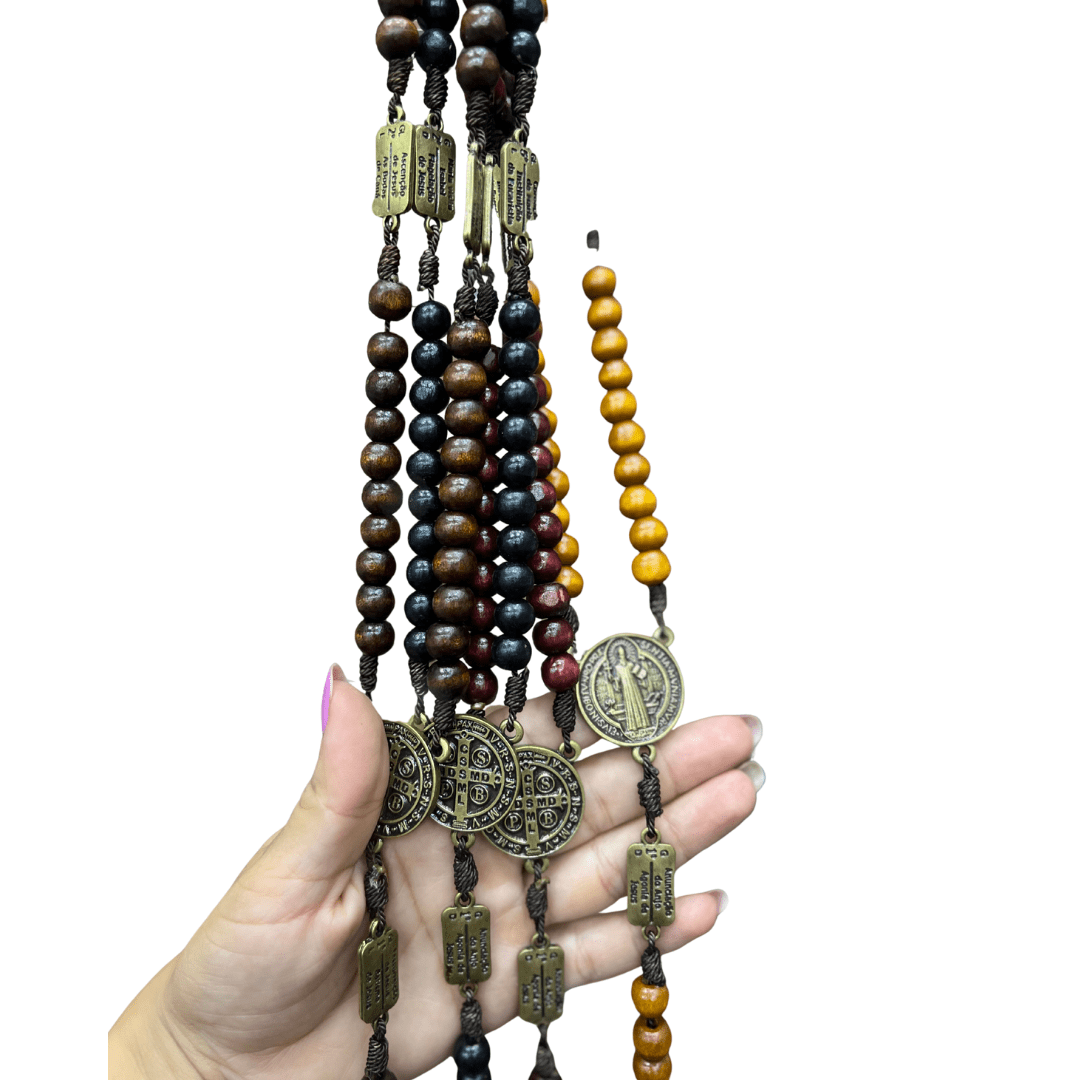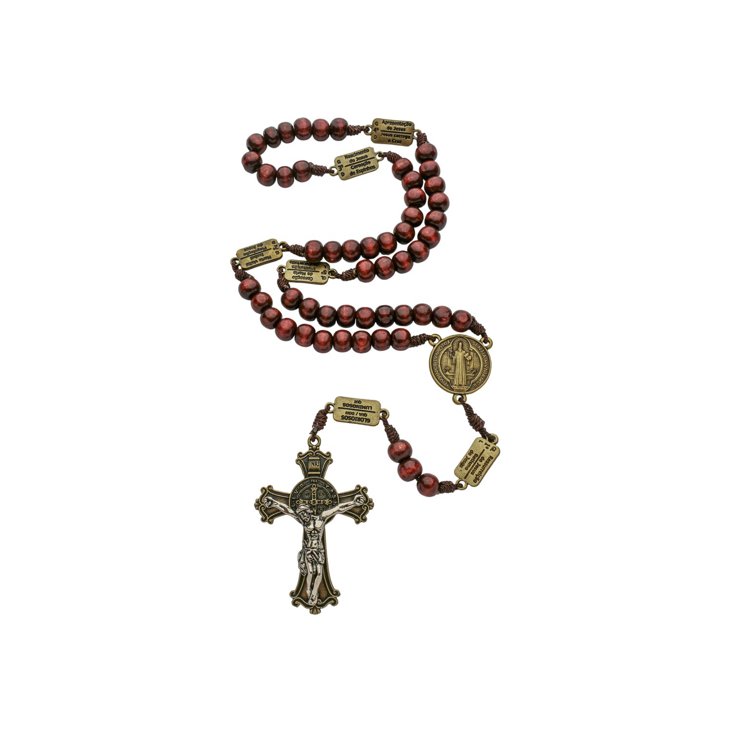 A cruz, confeccionada em metal bronze com detalhes na cor prata, destaca-se em alto relevo com a imagem do Cristo, tornando este terço uma peça única e cheia de significado. Tendo também a medalha de São Bento em ambos os lados inspirando a sua proteção.