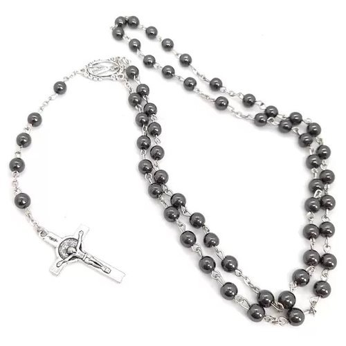 Terço com contas de hematita entremeio de Nossa senhora Aparecida .Características: Material: Pedras Hematita 6mm Acabamento: Cruz e medalha do entremeio feito em metal prata Comprimento: 47cm