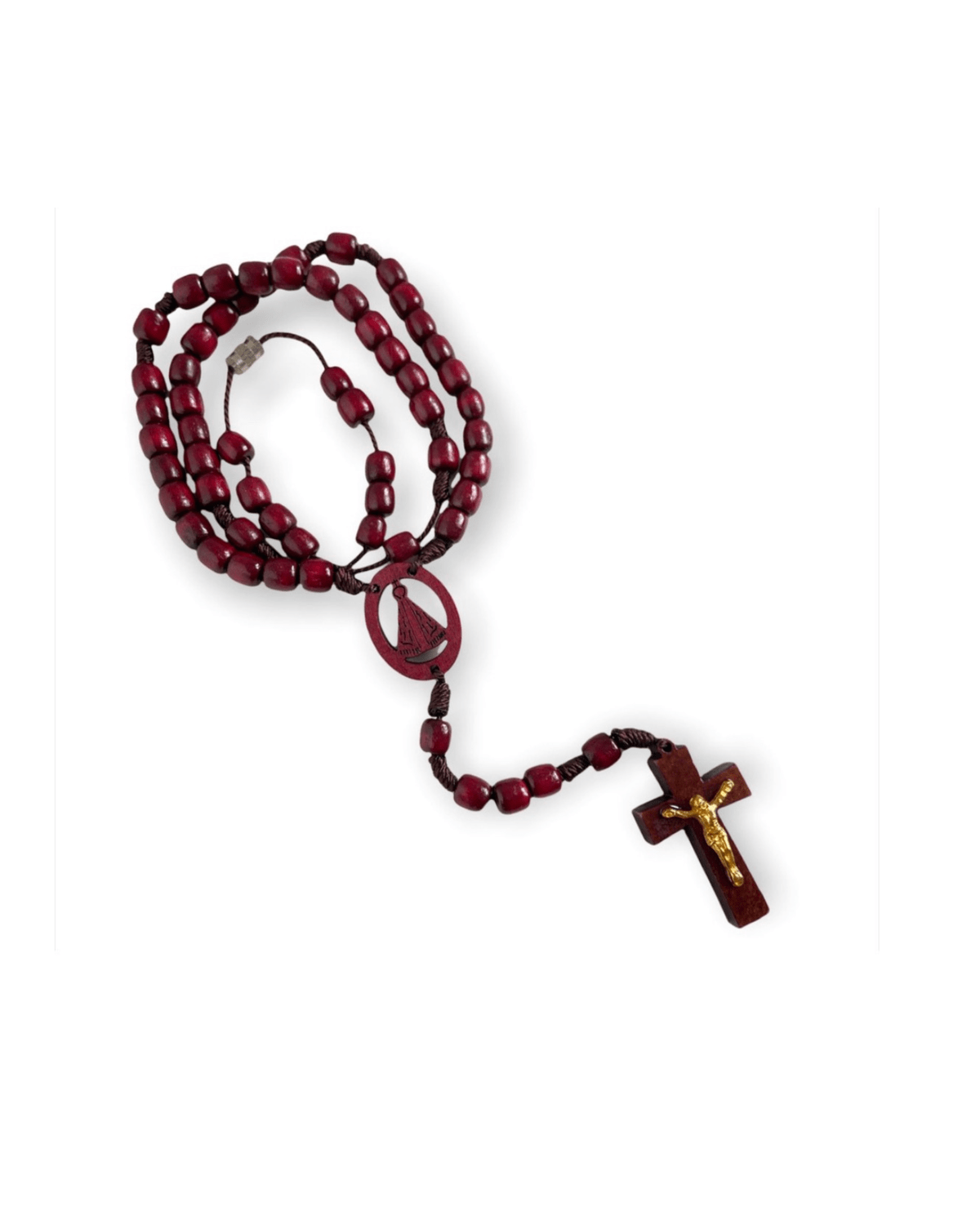 Esse belo terço possui contas e entremeio de madeira Pau Brasil. A medalha de  é feita em resina colorida e o crucifixo de madeira tem o Cristo Crucificado na cor dourada. Prático para o uso no dia a dia, esse terço de madeira é perfeito para expressar sua fé e confiança.