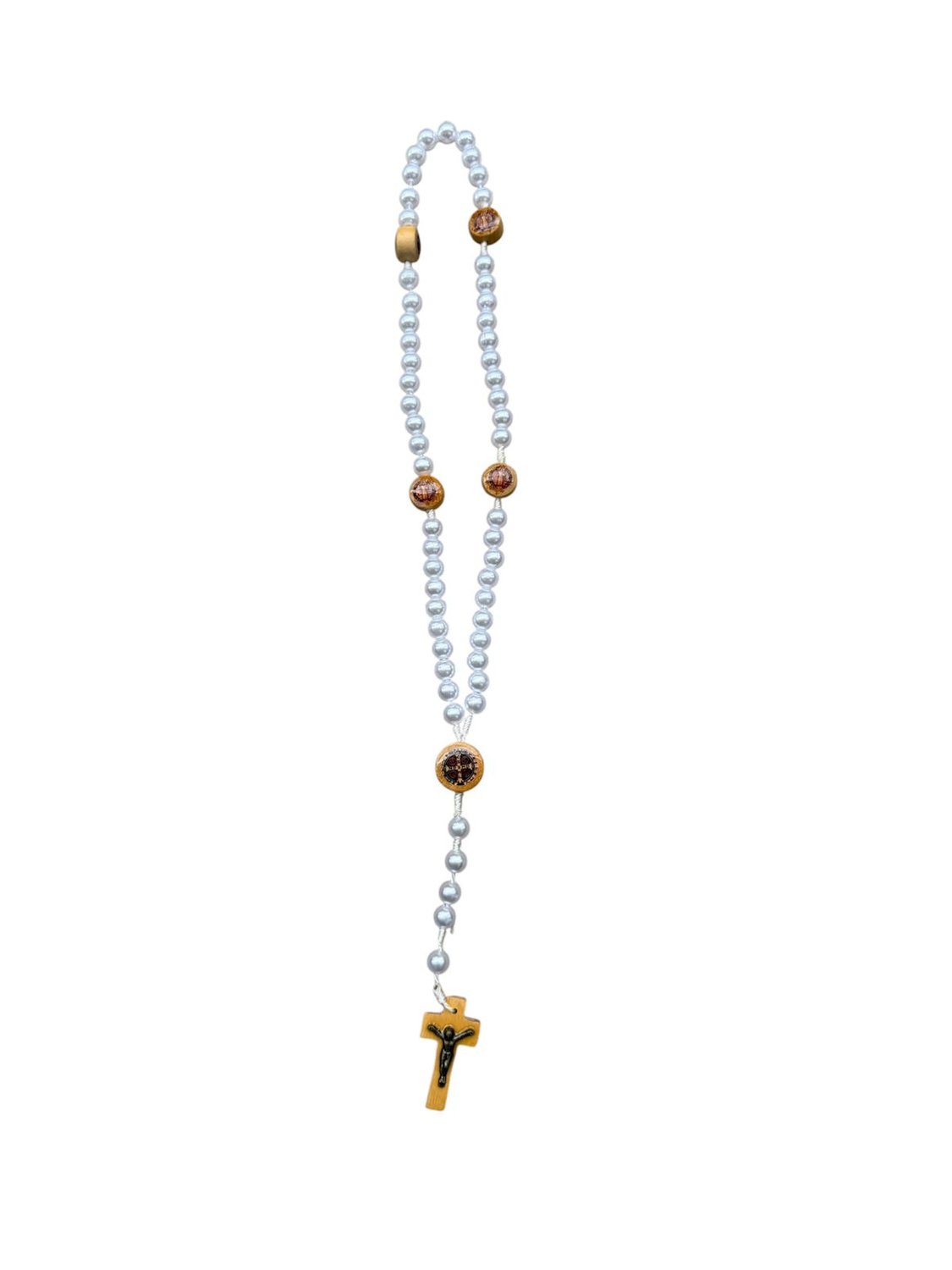 Esse belo terço possui contas de pérolas . A medalha de  é feita em resina colorida e o crucifixo de madeira tem o Cristo Crucificado na cor dourada. Prático para o uso no dia a dia, esse terço de madeira é perfeito para expressar sua fé e confiança.