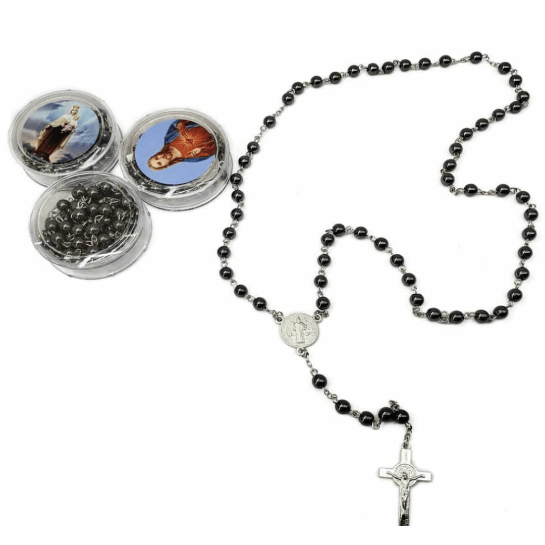 Terço com contas de hematita em corrente aço inoxidável, Com entremeio de São Bento .Características: Material: Pedras Hematita 6mm Acabamento: Cruz e medalha do entremeio feito em metal prata Comprimento: 47cm