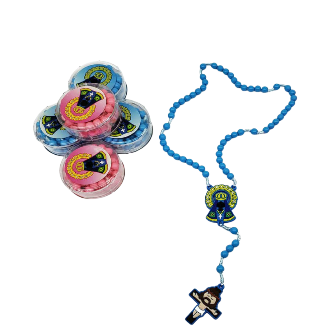 terço infantil, com entremeio de santos diversos, medalha nas cores azul ou rosa e crucifixo com cristo infantil em resina colorida na cor azul ou rosa.