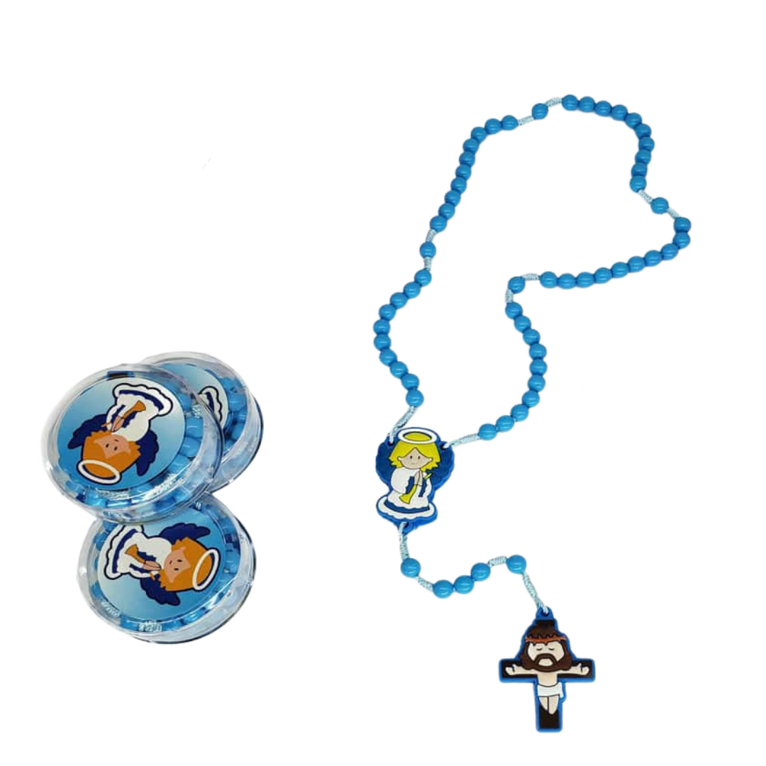 terço infantil, com entremeio de santos diversos, medalha nas cores azul ou rosa e crucifixo com cristo infantil em resina colorida na cor azul ou rosa.