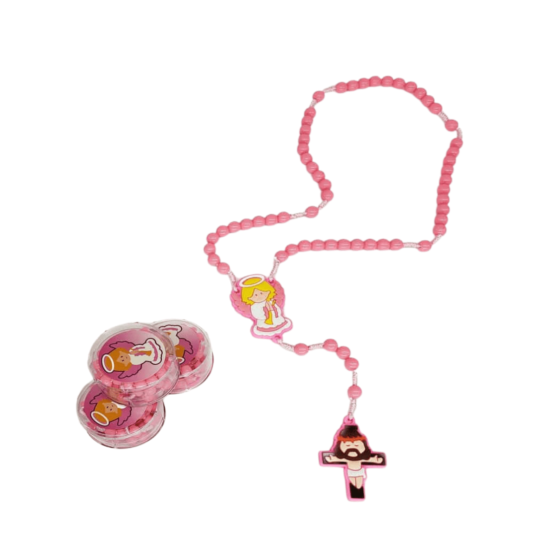 terço infantil, com entremeio de santos diversos, medalha nas cores azul ou rosa e crucifixo com cristo infantil em resina colorida na cor azul ou rosa.